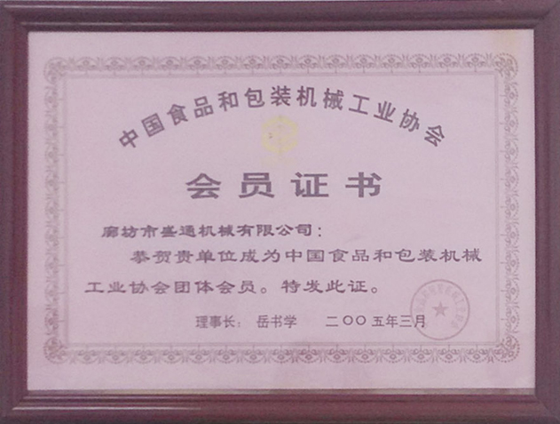中國食品和包裝機械工業協會-會員證